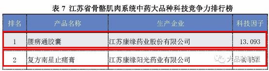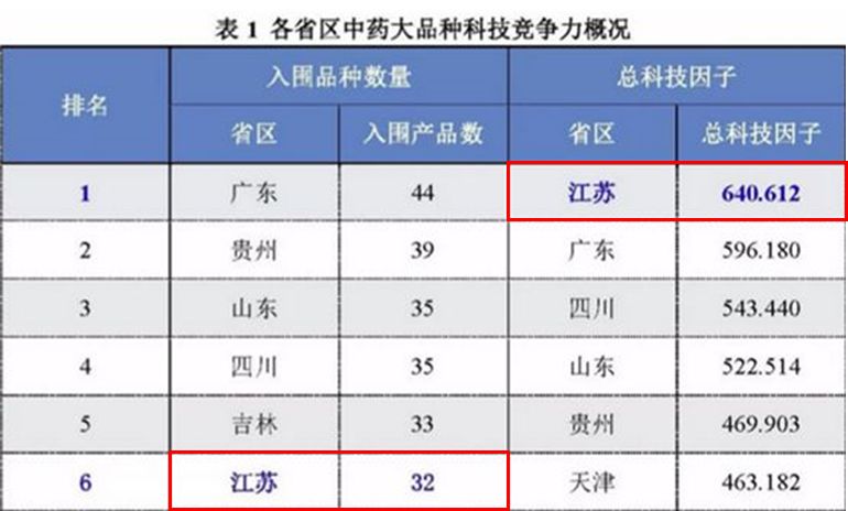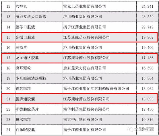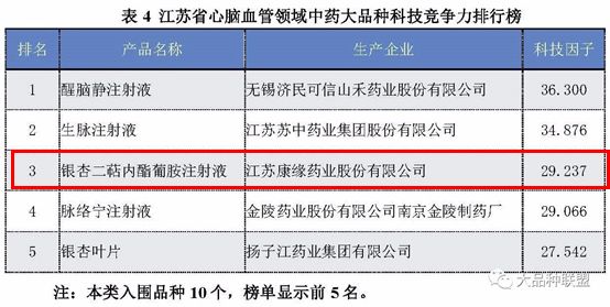 江苏省共入围32个中药大品种,排名全国第6位,总科技因子排名全国第1,康缘药业以入围产品12个的数量遥遥领先。(包括桂枝茯苓胶囊、热毒宁注射液、银杏二萜内酯葡胺注射液、散结镇痛胶囊、天舒胶囊、金振口服液、龙血通络胶囊、腰痹通胶囊、复方南星止痛膏、九味熄风颗粒、通塞脉片、大株红景天胶囊)
