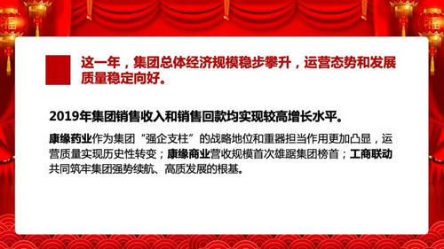2019年,是医药行业发展极不平静的一年。“三医联动”综合改革不断深入,行业发展局势、发展预期发生了重大变化。在风云激荡的经济形势和市场环境下,集团公司极限承压,攻坚克难,立足“百亿康缘”新起点,逐梦康缘“五年三百亿”新征程,核心医药板块护盘稳盘,核心品种培育扎实推进,积极打造新业态,开创新模式,孕育新动力,较好达成年初制定的主要目标任务。