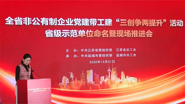 12月21日,由江苏省委组织部、省总工会组织的全省非公有制企业党建带工建“三创争两提升”活动省级示范单位命名暨现场推进会在盐城市召开,全省100家非公企业、各市组织部、工会领导干部代表参加会议。省总工会党组书记、副主席朱劲松、省总工会二级巡视员廖建华、省委组织部三处处长、“两新”工委办公室主任骆宇飞等领导出席此次会议。康缘集团获全省非公有制企业党建带工建“三创争两提升”活动示范单位,集团工会主席陈玥受邀代表获奖单位现场交流发言。