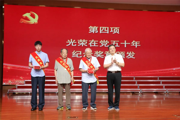 百年传承,薪火相继。会上,肖伟书记为董运爵等3名老党员代表颁授“光荣在党50年”纪念章,“光荣在党50年”是经中共中央批准颁发的,是荣誉,是嘉奖,更是传承,记载着他们的初心与本色。随后,在肖伟书记领誓下,新吸收的72名新党员和全体党员进行了入党宣誓和重温入党誓词,字字千钧、掷地有声,将党的精神进行传承和发扬。