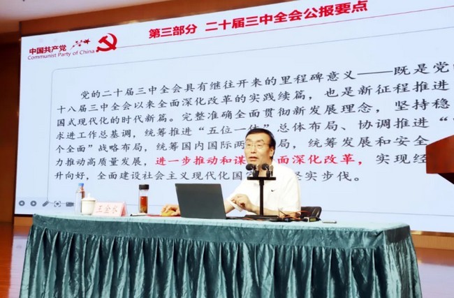 王金水教授从党的二十届三中全会基本概况、历届三中全会要点回顾、二十届三中全会公报要点、贯彻落实三中全会精神四个方面进行了系统阐述和深入解读。他指出,党的二十届三中全会具有继往开来的里程碑意义——既是党的十八届三中全会以来全面深化改革的实践续篇,也是新征程推进中国式现代化的时代新篇,要深入学习全会精神,深刻领会和把握进一步全面深化改革的主题、重大原则、重大举措、根本保障。通过专题解读,参会人员对全会的概念、精神、内容等有了更加深刻的认识,为广大党员干部、职工群众在新一轮发展中找准目标方位、发挥自身优势、扛起责任担当、实现创新突破提供了理论依据、方法思路。